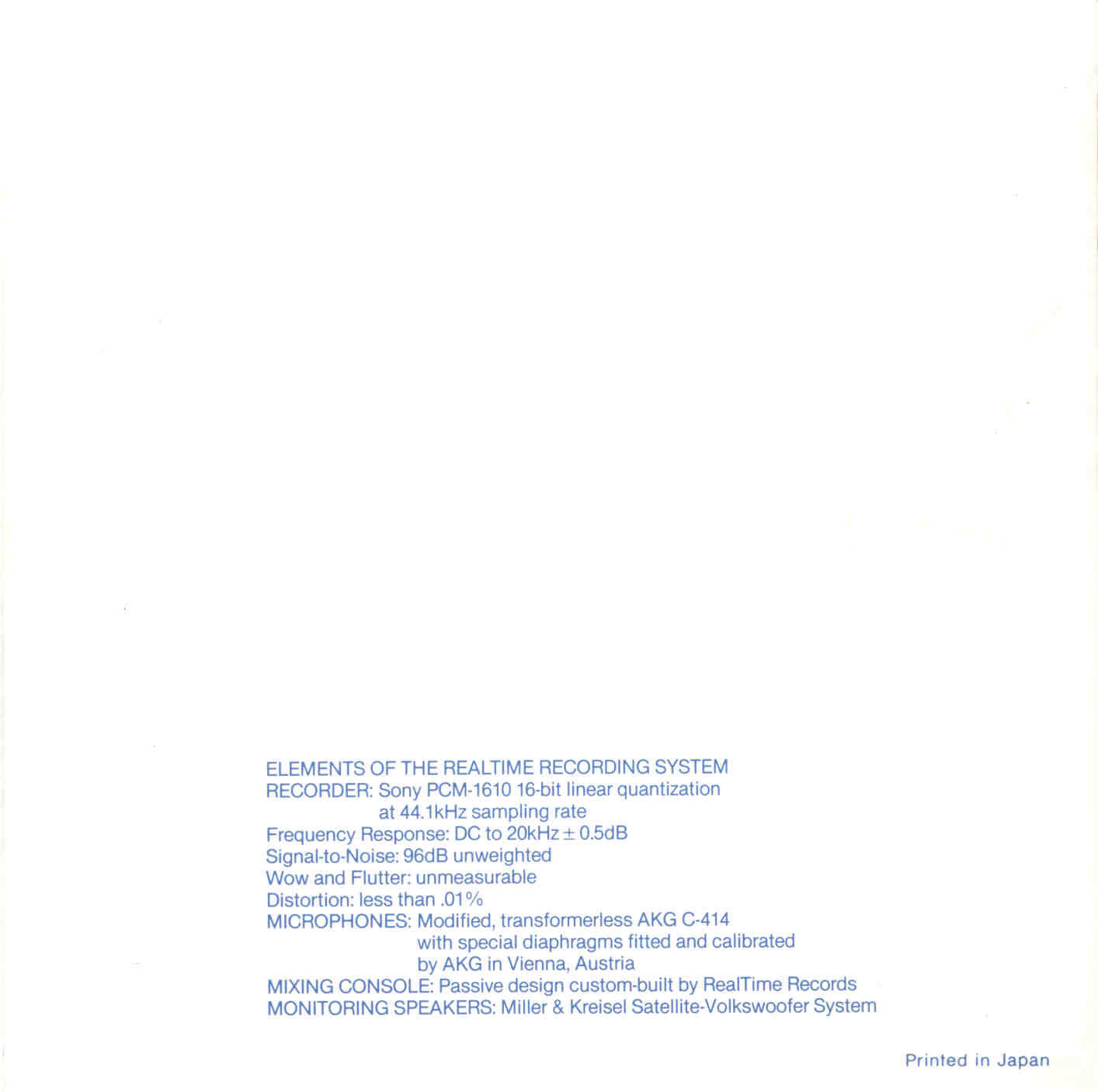| Label: Realtime | Disk #: RT 30099 | Disk copyright: Miller & Kreisel Sound Corp. 1983 | |
